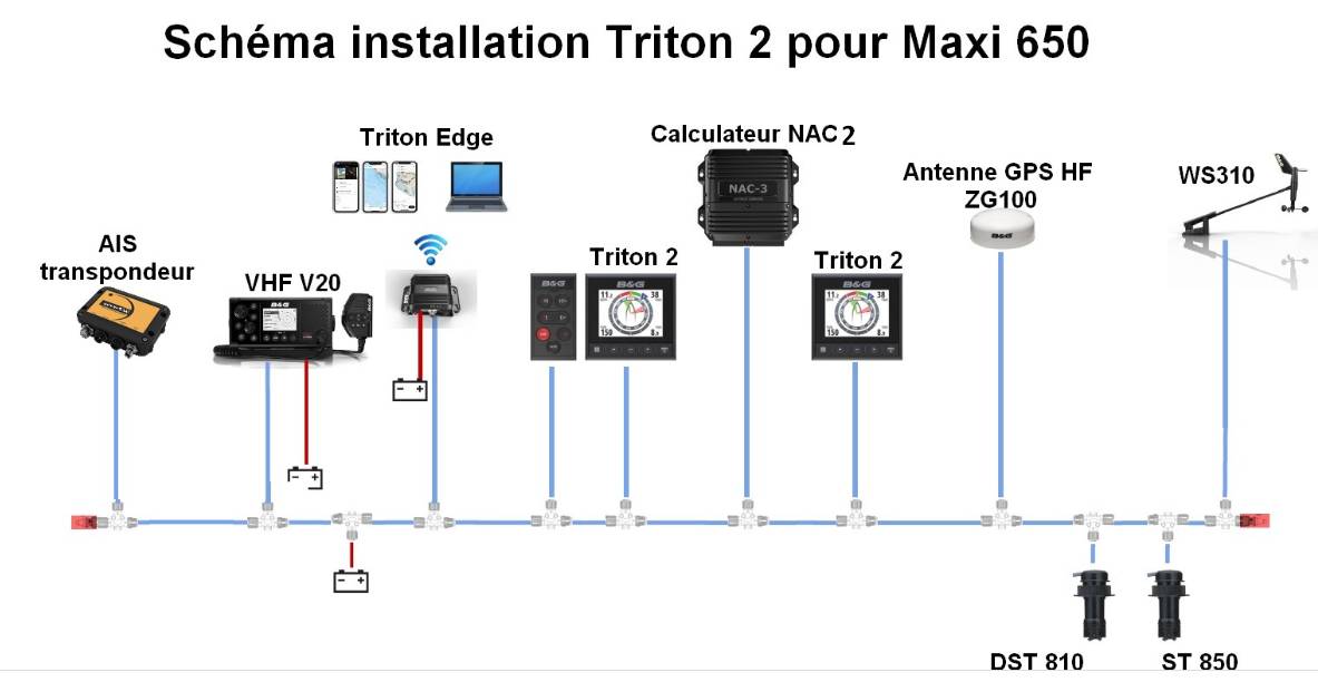Pour le Maxi 650, vous trouverez ci dessous le schéma d’installation préconisé. Pour un Mojito 650, on peut rester avec un seul capteur loch/speedo.