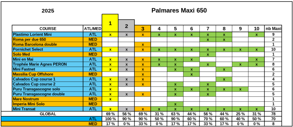 - Mini-transat : 1er, 5ième, 6ième, 7ième, 9ième….
